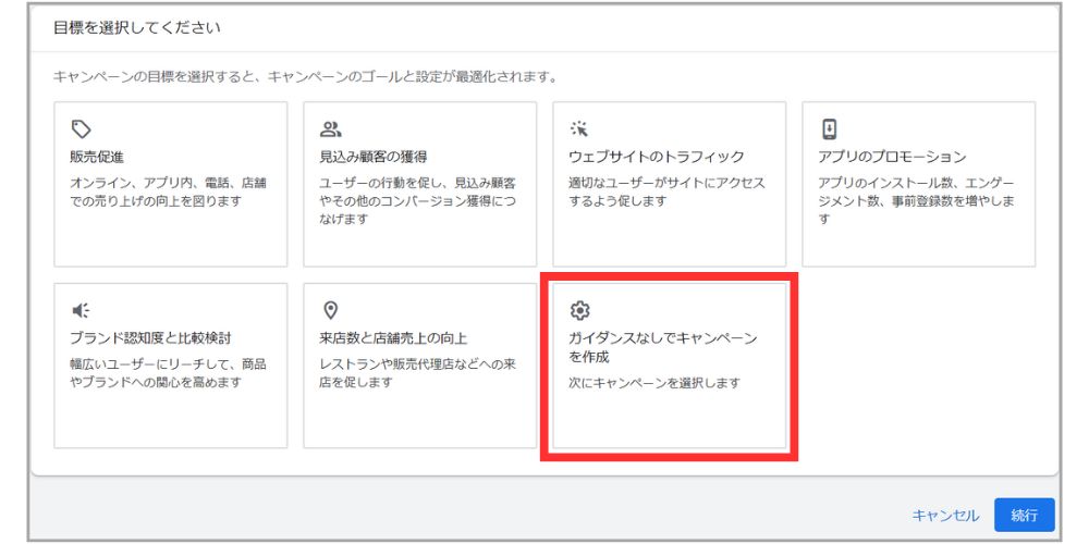 次に、キャンペーンの目標を設定してください。もし目標設定に迷う場合は、「ガイダンスなしでキャンペーンを作成」を選択しても問題ありません。